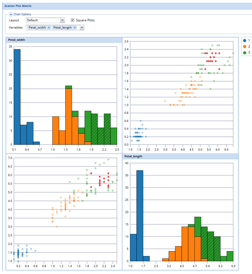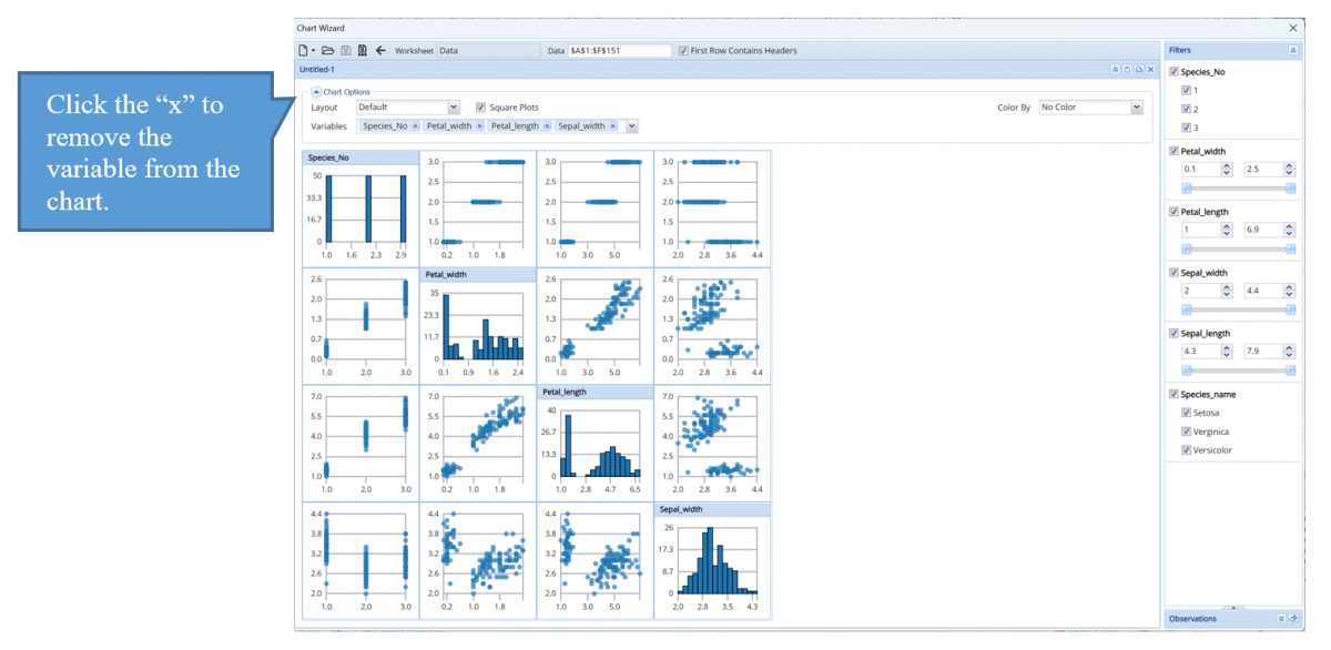 Remove all variables except Petal_width and Petal_length, then use the Color By feature to easily see the petal characterisitics of each species of iris.
