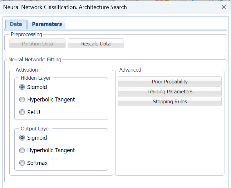 Note: When selecting a rescaling technique, it's recommended that you apply Normalization ([0,1)] if Sigmoid is selected for Hidden Layer Activation and Adjusted Normalization ([-1,1]) if Hyperbolic Tangent is selected for Hidden Layer Activation. This applies to both classification and regression. Since we will be using Logistic Sigmoid for Hidden Layer Activation, Normalization was selected.