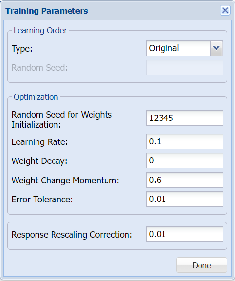 Users can change both the Training Parameters and Stopping Rules for the Neural Network. Click Training Parameters to open the Training Parameters dialog. For more information on these options, please see the Neural Network Classification Options section below. For now, simply click Done to accept the option defaults and close the dialog.