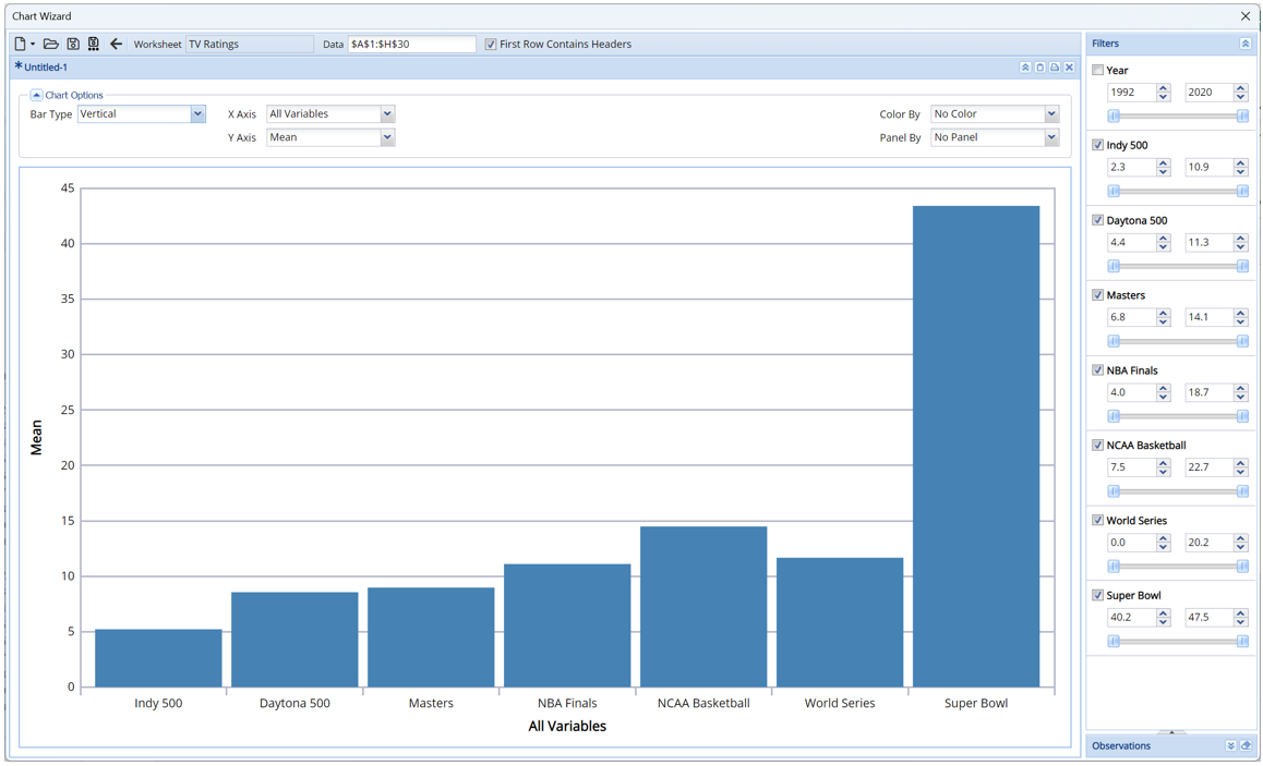 This example describes the use of the Bar Chart in Analytic Solver to illustrate the details of the Sports TV Ratings dataset.