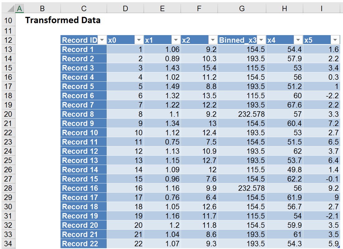 The output sheet, Bin_Transform3, shows us which records have been assigned to each of the 4 bins. The value of the binned variable is the midpoint of each interval: 115.5 for Bin 1, 154.5 for Bin 2, 193.5 for Bin 3 and 232.5 for Bin 4. In the first record, x3’s value is 154.4. Since this value lies in the interval for Bin 2 (135 – 174) the mid value of this interval is reported for the Binned_x3 variable, 154.5. In the last record, x3’s value is 193.5. Since this value lies in the interval for Bin 3 (174 – 213), the mid value of this interval is reported for the Binned_x3 variable, 193.5.