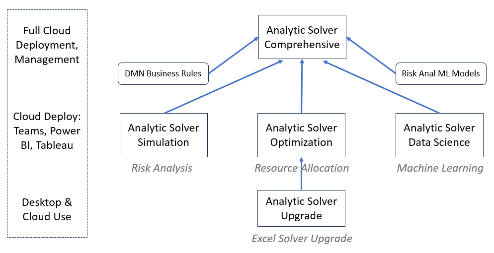 But with Analytic Solver and RASON, you don't have to start over -- you can move beyond Excel while leveraging the work you did in Excel. Your model in Excel can be used in Teams, in a Power BI or Tableau dashboard, in a Python program, or in a mobile app -- quickly and easily! With our revised product line structure, we hope to highlight this, and enable you to go further than you have so far. That will include new incentives to upgrade to Analytic Solver Comprehensive!