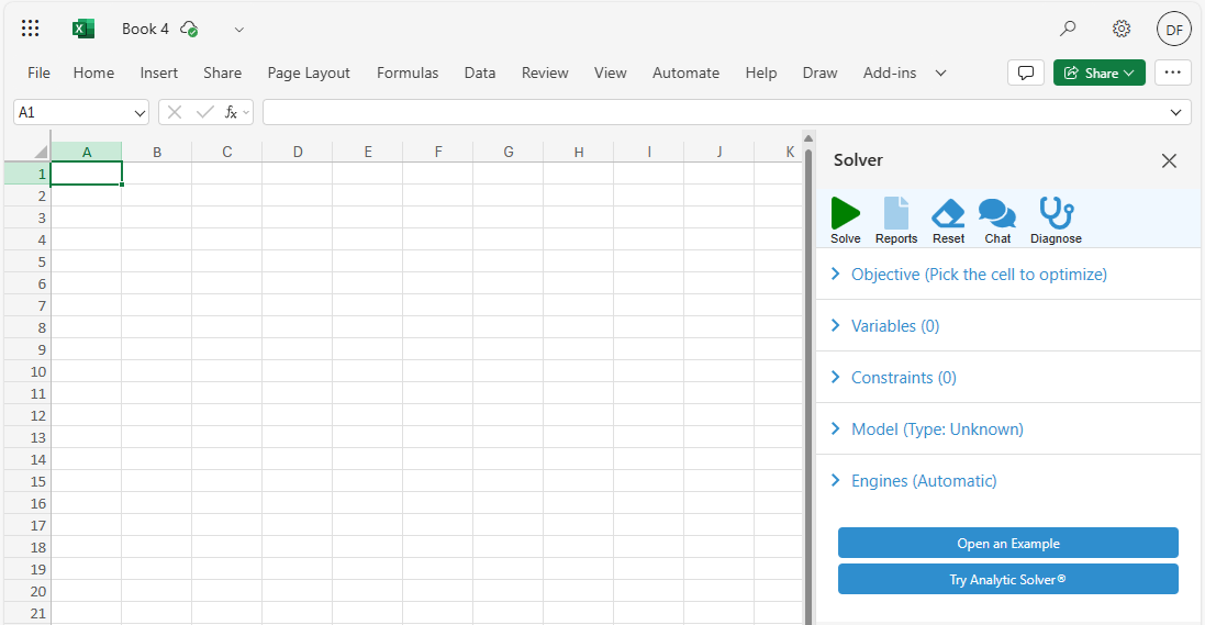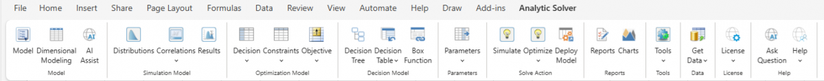When you click Try it free for 15 days ... then allow Excel to "get the Analytic Solver App" ... you'll immediately have Analytic Solver Cloud Version, in Excel for the Web (or Excel desktop)! You'll need a few seconds to complete a simple registration form (one dialog) to obtain your free trial license -- then you'll be ready to start solving! And you'll find an incredible range of resources at your fingertips, from even more example models (nearly 150!) to online Help, Wizards, Guided Mode, Live Chat with our technical support staff, an AI Agent pre-trained on all our User Guides and Reference Guides so you can just ask questions, and even an AI Assistant for your Excel model that helps you fix errors and make enhancements!