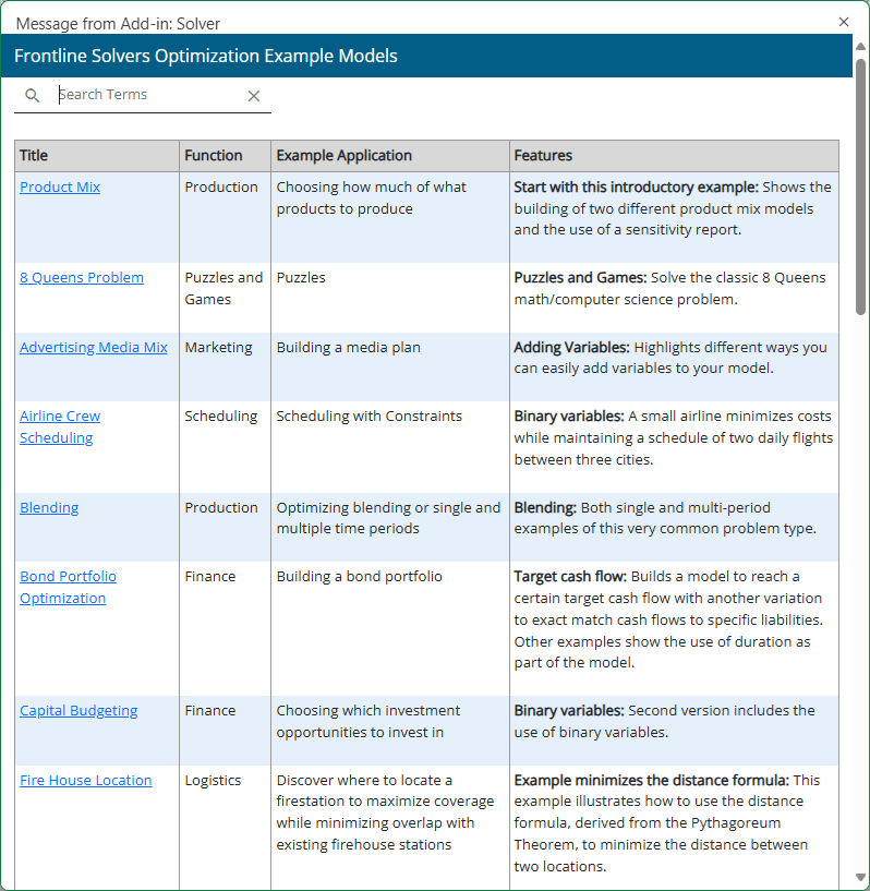 In our 2025 Solver App -- available right now for everyone -- you can click the button Open an Example as pictured above, and choose any of 26 example workbooks! The examples range from finance and investment (capital budgeting, stock and bond portfolio optimization) to manufacturing (machine allocation, inventory planning, process operation) to distribution and logistics (transportation of goods, partial loading) to personnel (call center and airline crew scheduling, workforce reorganization). Again you just click on an example to open a new workbook -- in the browser or in desktop Excel -- with all the data, formulas, comments, formatting, and Solver model definitions needed for that model. (And yes, these examples work in both Excel desktop and Excel for the Web!)