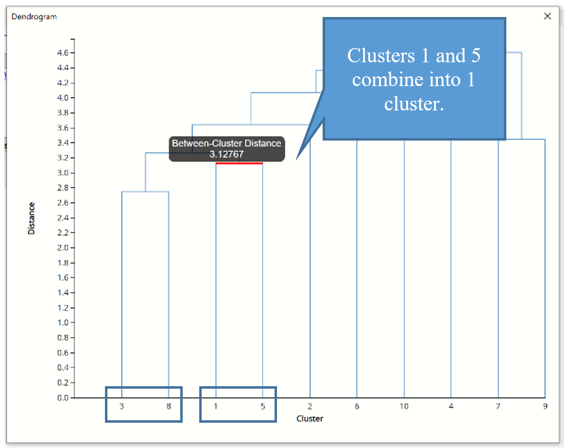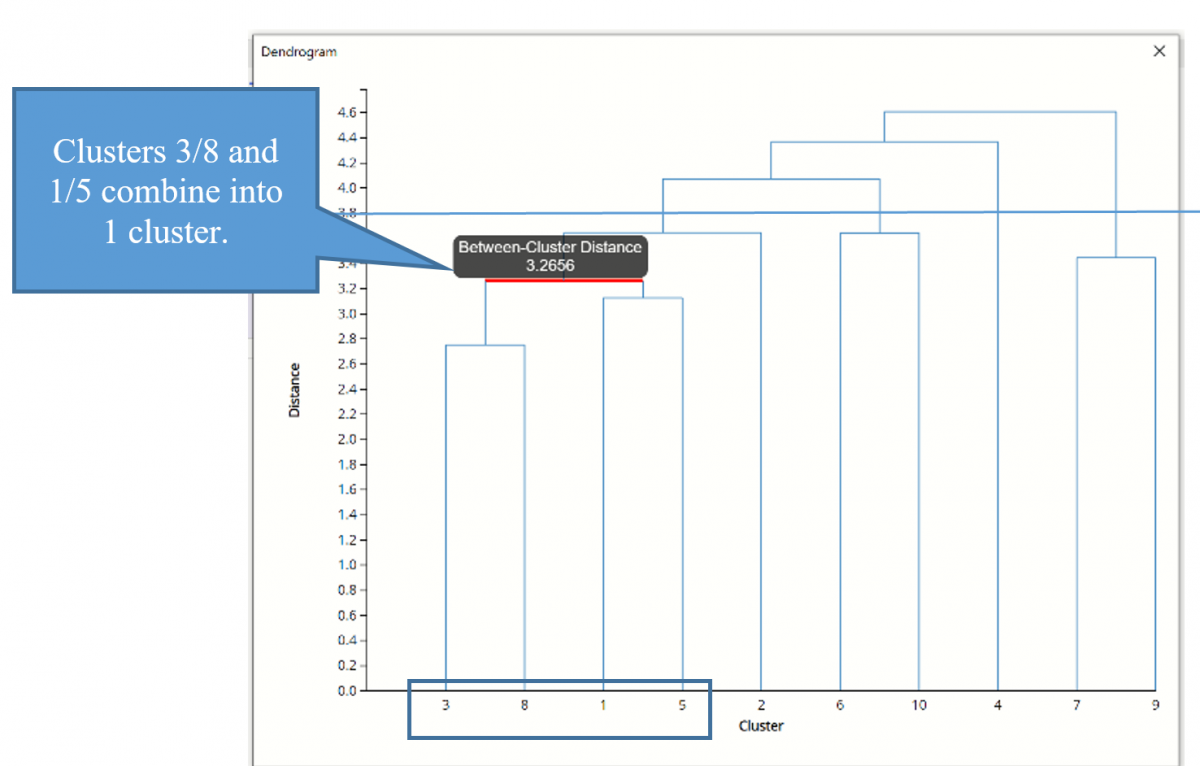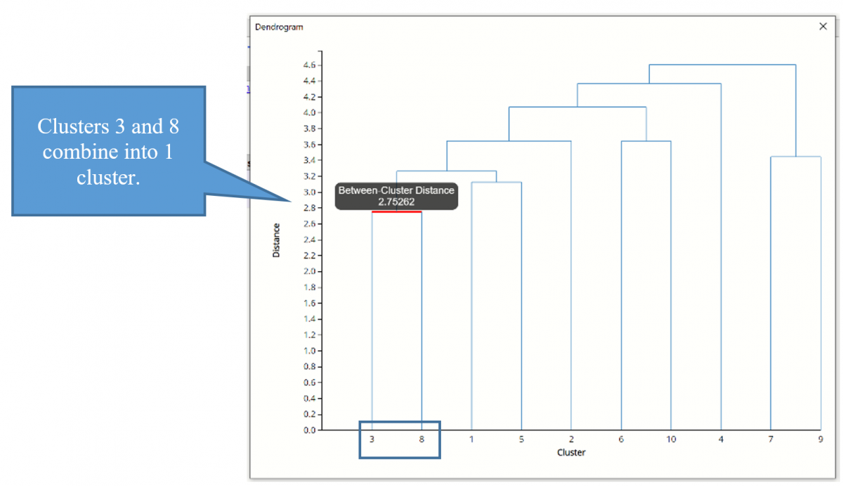 The Sub Cluster IDs are listed along the x-axis (in an order convenient for showing the cluster structure). The y-axis measures inter-cluster distance. Consider Cluster IDs 3 and 8-- they have an inter-cluster distance of 2.753. (Hover over the horizontal connecting line to see the Between-Cluster Distance.) No other cases have a smaller inter-cluster distance, so 3 and 8 are joined into one cluster, indicated by the horizontal line linking them.