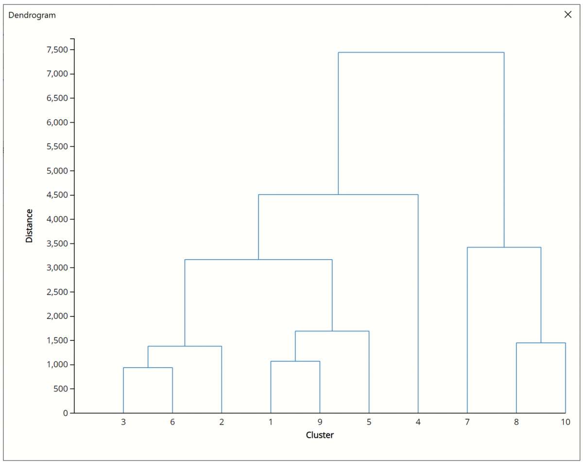 Click the HC_Dendrogram worksheet tab to view the clustering dendrogram. A dendrogram is a diagram that illustrates the hierarchical association between the clusters.