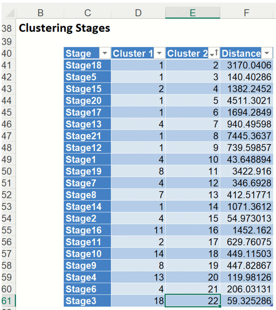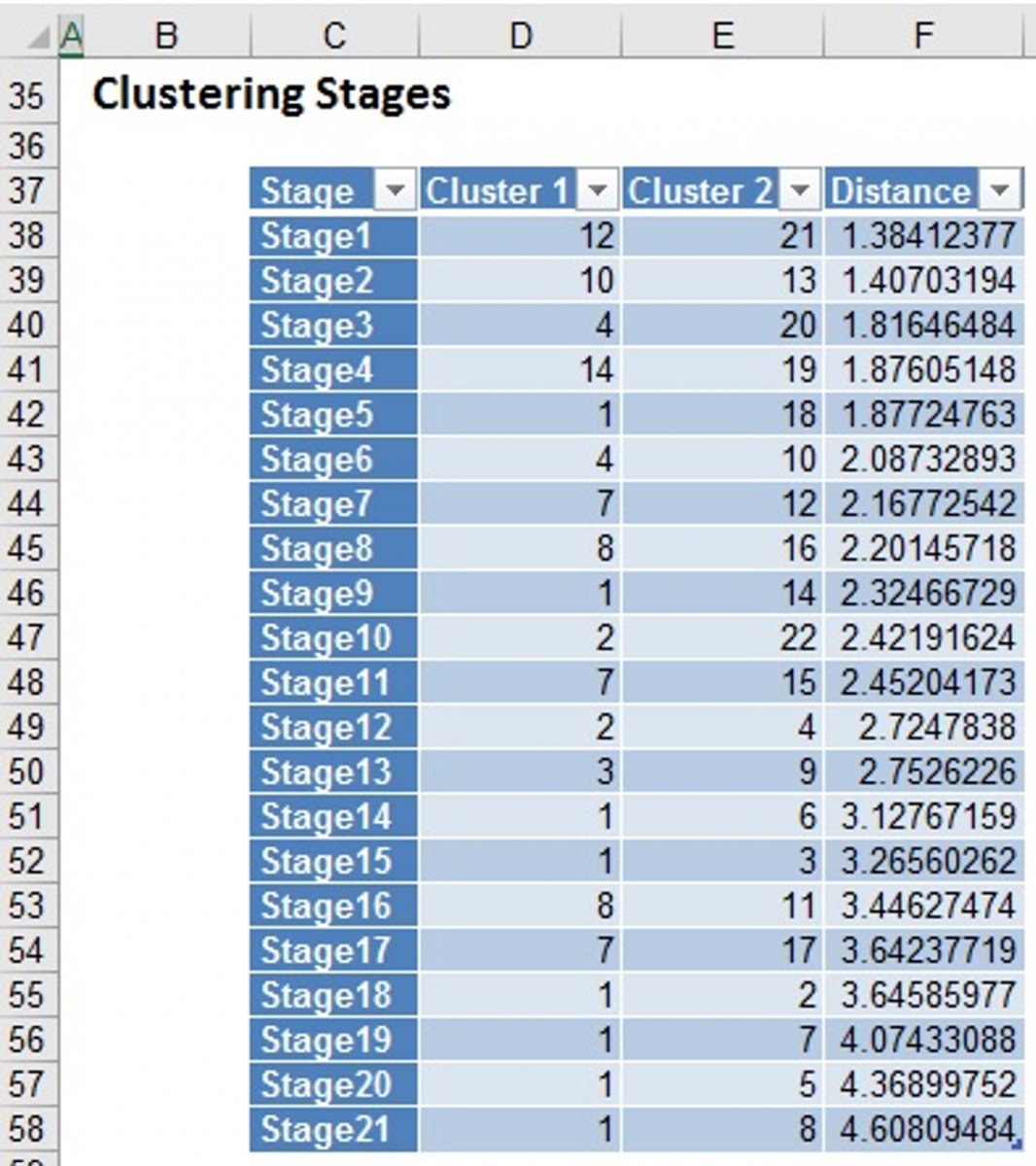 Further down the HC_Output sheet is the Clustering Stages table. This table details the history of the cluster formation. Initially, each individual case is considered its own cluster (single member in each cluster). Analytic Solver Data Science begins the method with # clusters = # cases. At stage 1, below, clusters (i.e. cases) 12 and 21 were found to be closer together than any other two clusters (i.e. cases), so they are joined together in to cluster 12. At this point there is one cluster with two cases (cases 12 and 21), and 21 additional clusters that still have just one case in each. At stage 2, clusters 10 and 13 are found to be closer together than any other two clusters, so they are joined together into cluster 10.
