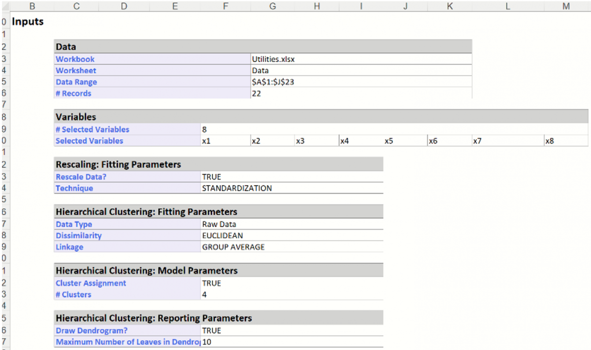 As in the example above, the top of the HC_Output worksheet is the Inputs portion, which displays the choices selected on both tabs of the Hierarchical Clustering dialog.