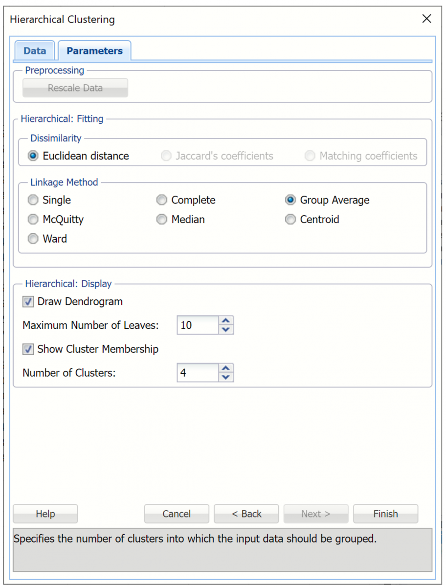 Leave Draw dendrogram, Maximum Number of Leaves. Set Number of Clusters to 4.