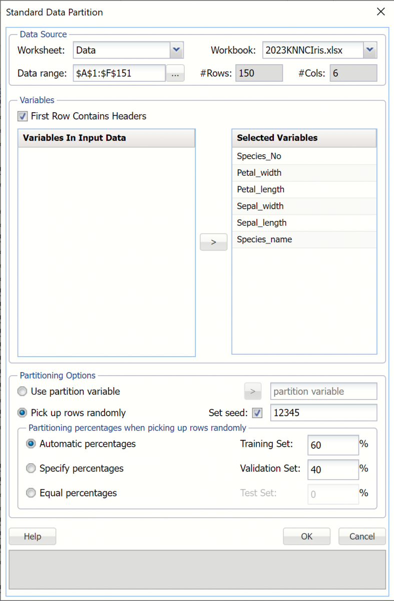 Partition the data using a standard partition with percentages of 60% training and 40% validation (the default settings for the Automatic choice).    For more information on how to partition a dataset, please see the previous Data Science Partitioning chapter.