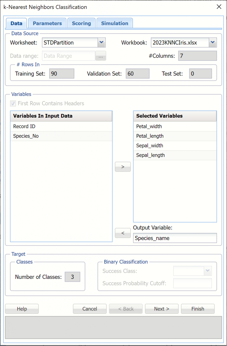 Select Petal_width, Petal_length, Sepal_width, and Sepal_length under Variables in Input Data then click > to select as Selected Variables.  Select Species_name as the Output Variable.