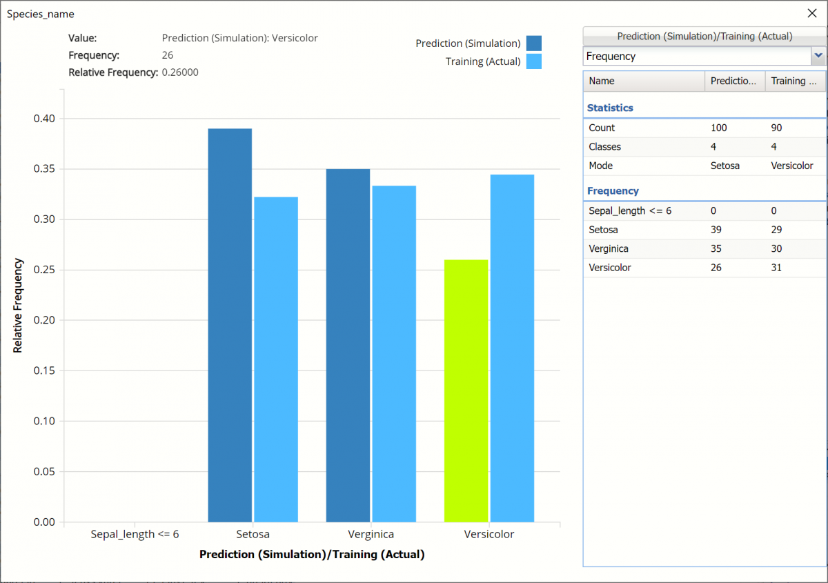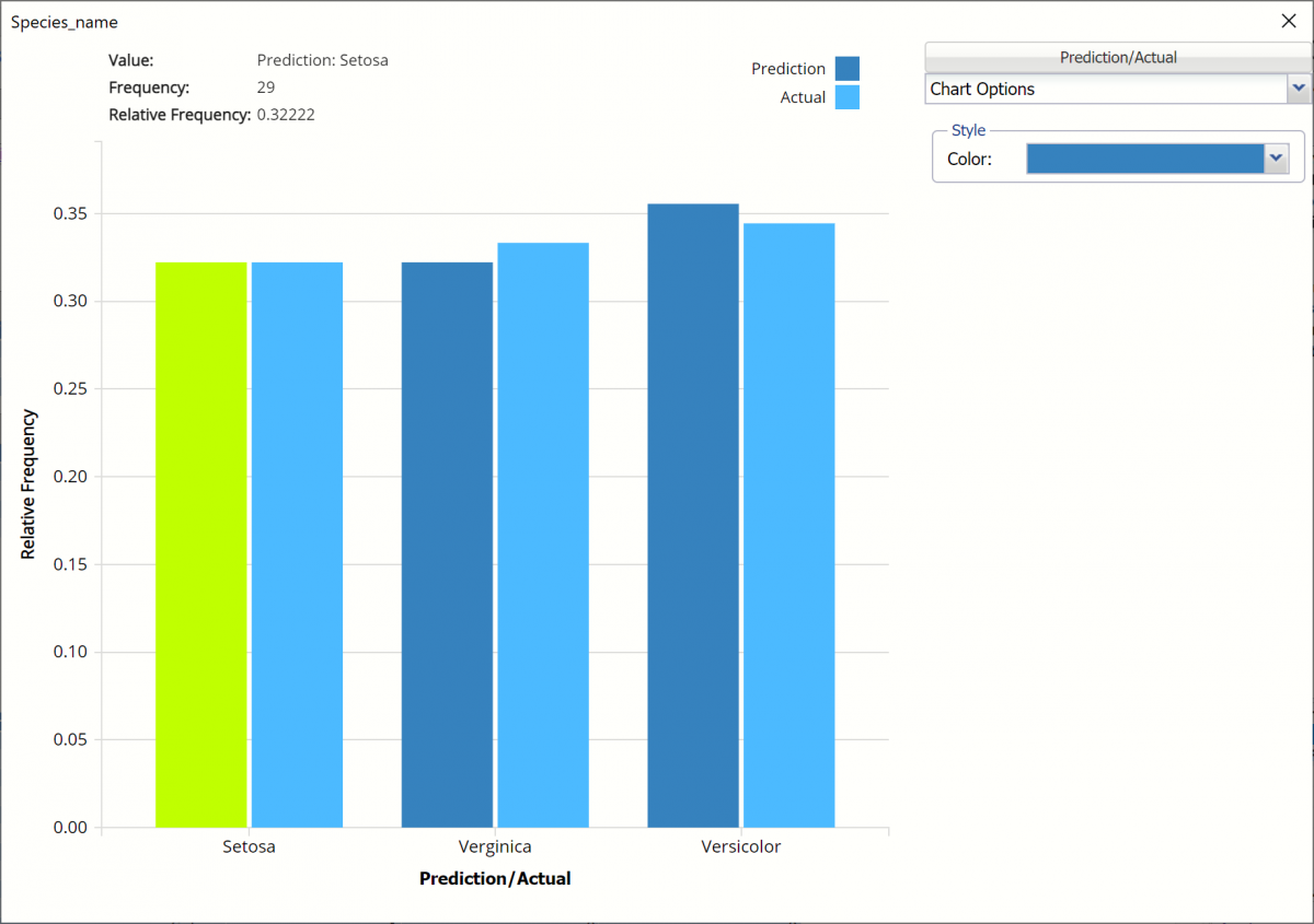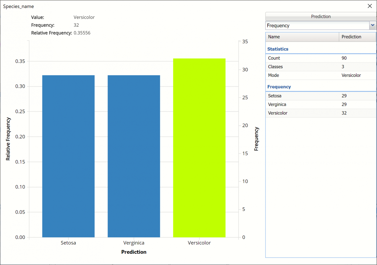 Click the Frequency chart to display the frequency for both the predicted and actual values of the output variable, along with various statistics such as count, number of classes and the mode.  Selective Relative Frequency from the drop down menu, on the right, to see the relative frequencies of the output variable for both actual and predicted.  See above for more information on this chart.