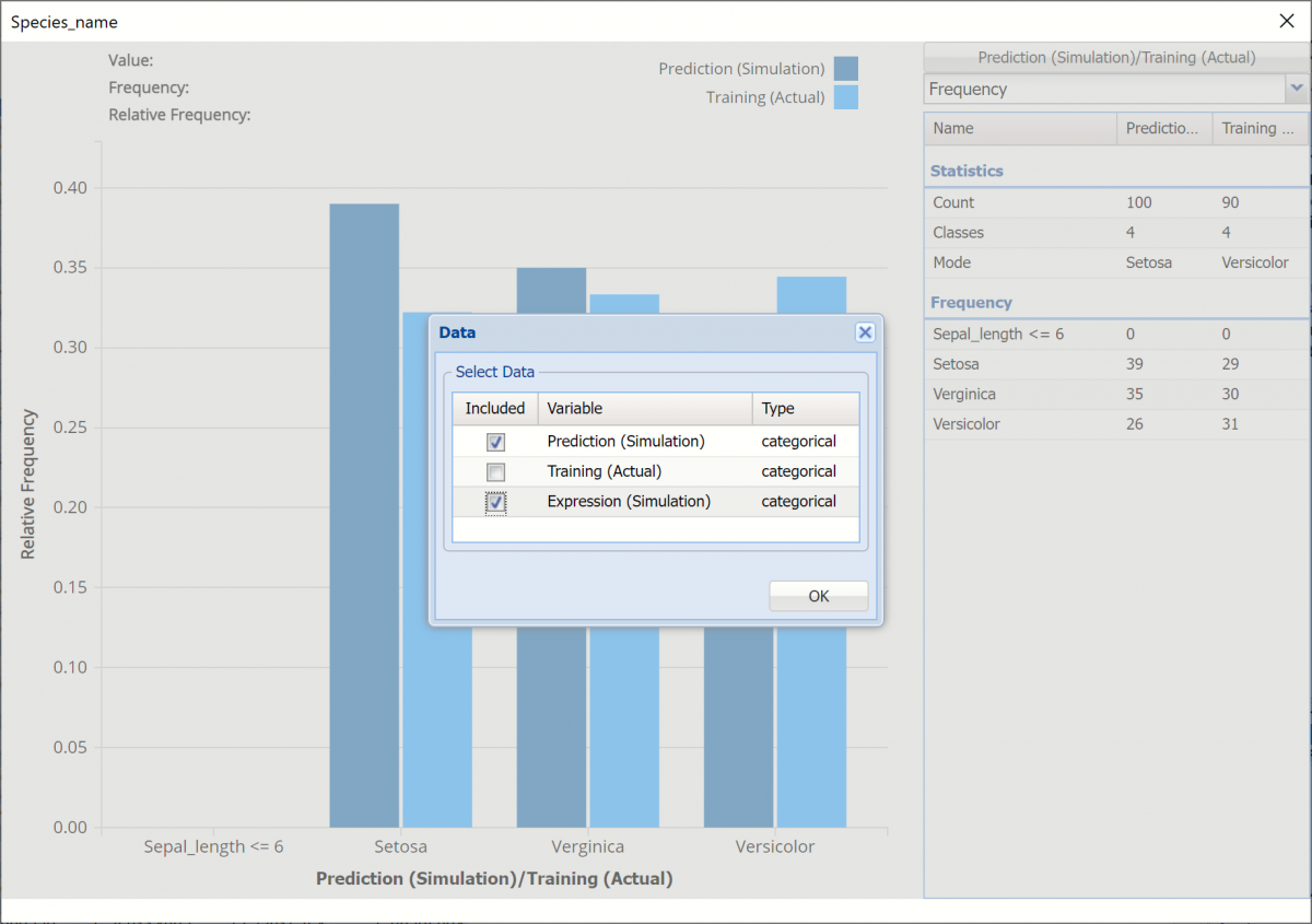 For the purposes of this example, leave all options at their defaults in the Distribution Fitting, Correlation Fitting and Sampling sections of the dialog.  For Expression, enter the following formula to display Species_name if Sepal_length is greater than 6.