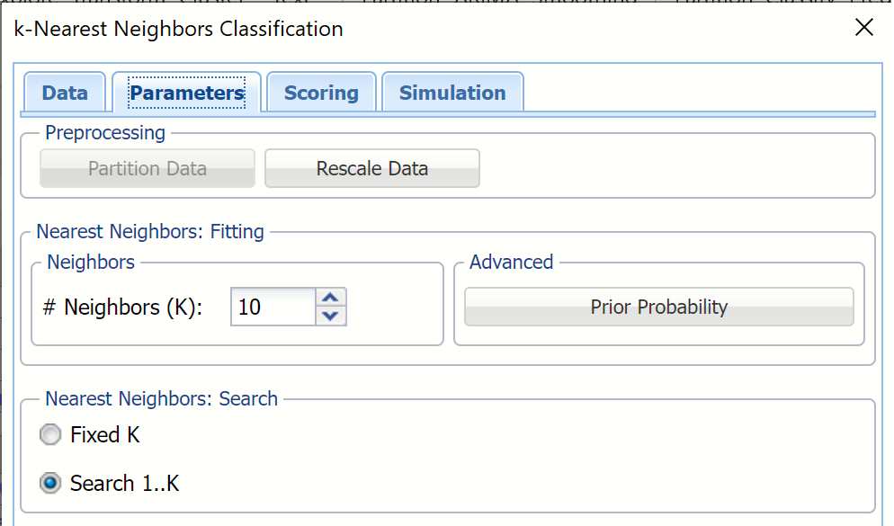 Select Search 1..K under Nearest Neighbors Search.  When this option is selected, Analytic Solver Data Science will display the output for the best k between 1 and the value entered for # Neighbors.  If Fixed K is selected, the output will be displayed for the specified value of k.