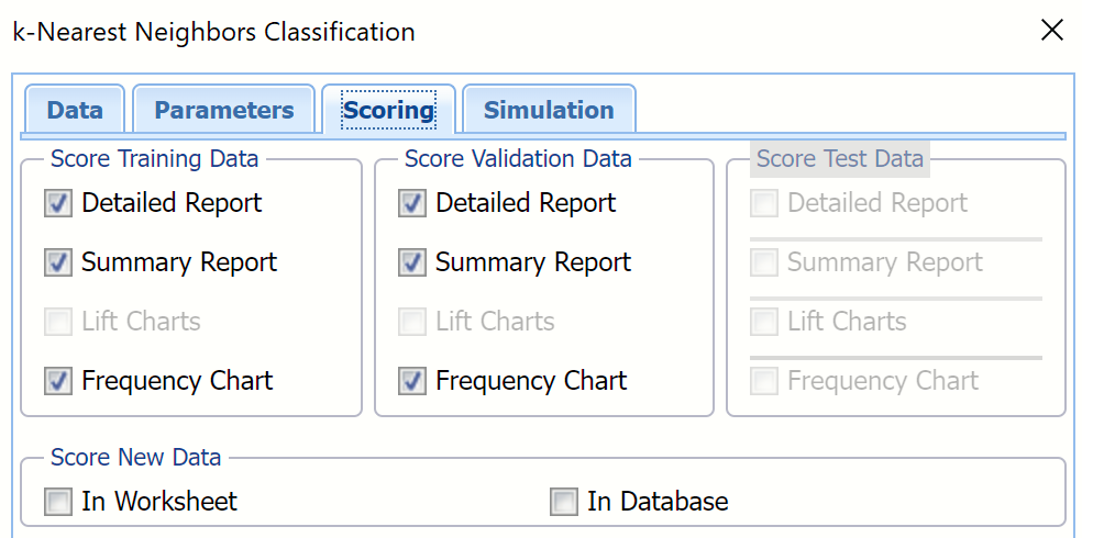 For more information on the Score new data options, please see the “Scoring New Data” chapter in the Analytic Solver Data Science User Guide.