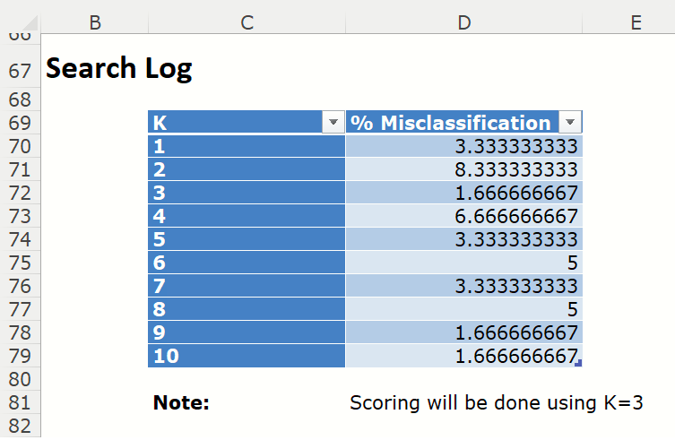 The Search Log for the different k's lists the % Misclassification errors for all values of k for the validation data set, if present. The k with the smallest % Misclassification is selected as the “Best k”.  Scoring is performed later using this best value of k.