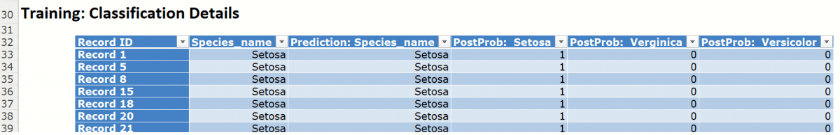 Classification Details:  This table displays how each observation in the training data was classified.  The probability values for success in each record are shown after the predicted class and actual class columns.  Records assigned to a class other than what was predicted are highlighted in red.
