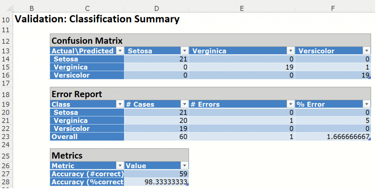 This Summary report tallies the actual and predicted classifications.  (Predicted classifications were generated by applying the model to the validation data.)  Correct classification counts are along the diagonal from the upper left to the lower right.