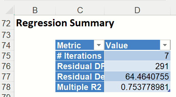 Regression Summary: Summary statistics, found directly below Inputs in the Regression Summary report, show the residual degrees of freedom (#observations - #predictors), a standard deviation type measure for the model (which typically has a chi-square distribution), the number of iterations required to fit the model, and the Multiple R-squared value.