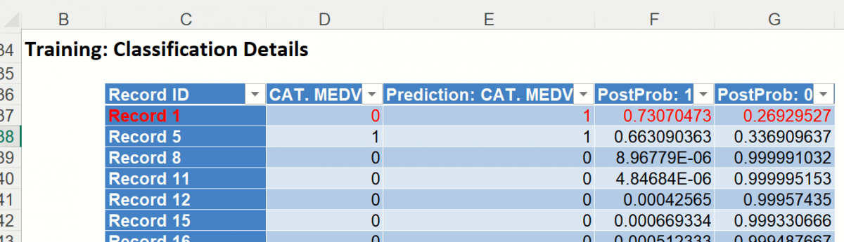 Training: Classification Details: This table displays how each observation in the training data was classified. The probability values for success in each record are shown after the predicted class and actual class columns. Records assigned to a class other than what was predicted are highlighted in red.