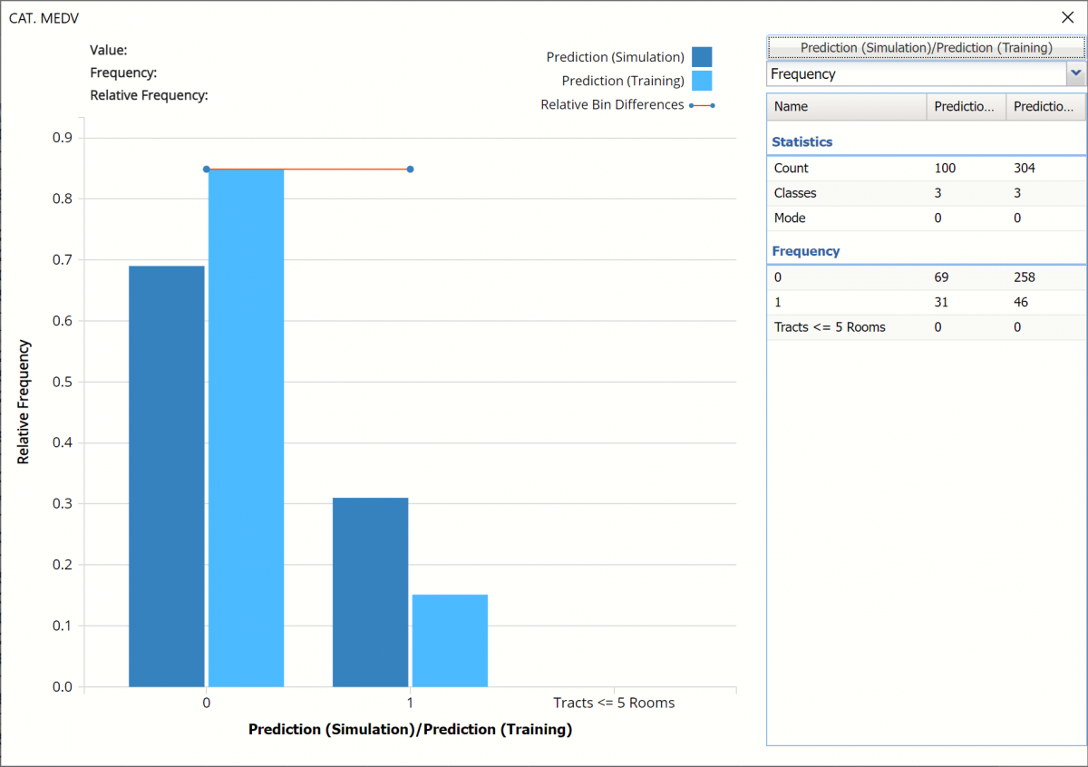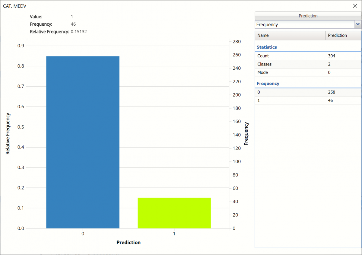 Click the Frequency chart to display the frequency for both the predicted and actual values of the output variable, along with various statistics such as count, number of classes and the mode. Selective Relative Frequency from the drop down menu, on the right, to see the relative frequencies of the output variable for both actual and predicted. See above for more information on this chart.
