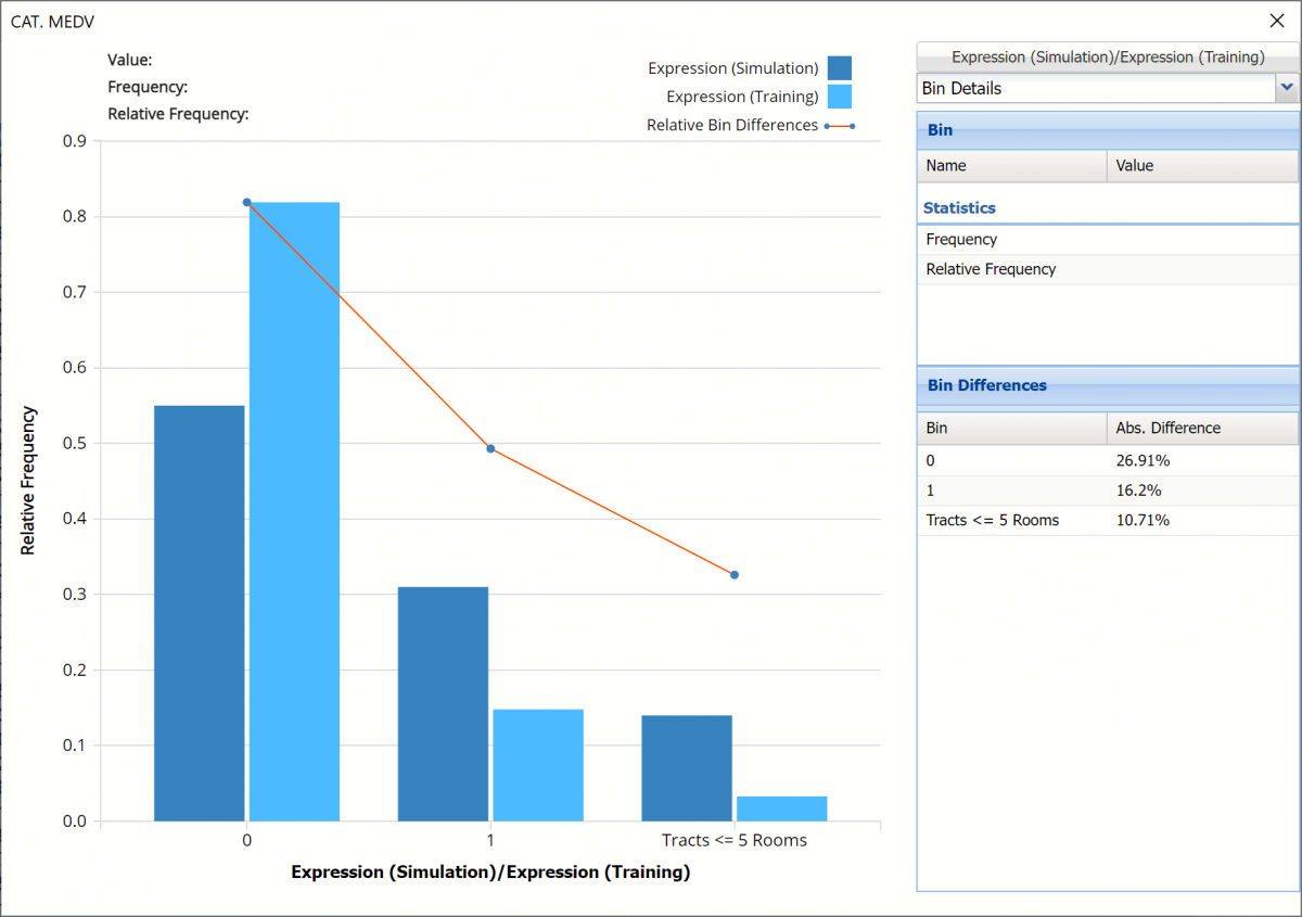 The chart that is displayed once this tab is selected, contains frequency information pertaining to the output variable in the actual data and the synthetic data. In the screenshot below, the bars in the darker shade of blue are based on the synthetic data. The bars in the lighter shade of blue are based on the predicted values for the training partition. In the synthetic data, about 70% of the housing tracts where CAT. MEDV = 0, have more than 5 rooms and about 85% of the housing tracts in the training partition where CAT. MEDV = 0 have more than 5 rooms.
