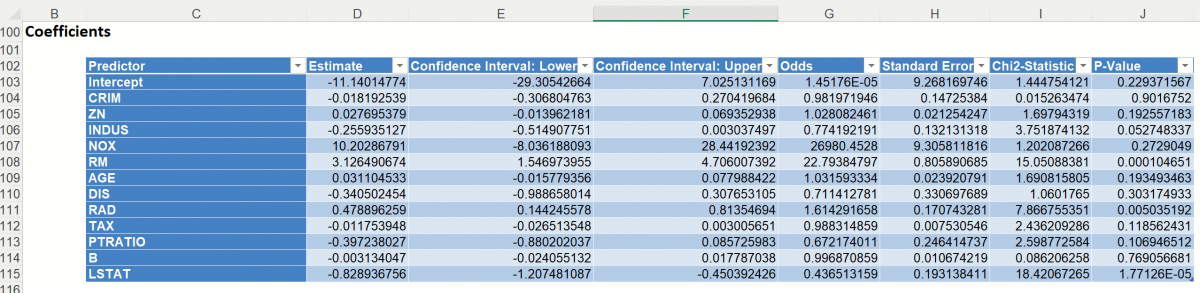Output sheets containing the Logistic Regression results will be inserted into your active workbook to the right of the STDPartition worksheet.