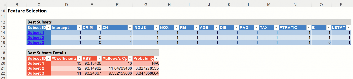 Since we selected Perform Feature Selection on the Feature Selection dialog, Analytic Solver Data Science has produced the following output on the LogReg_FS tab which displays the variables that are included in the subsets. This table contains the two subsets with the highest Residual Sum of Squares values.