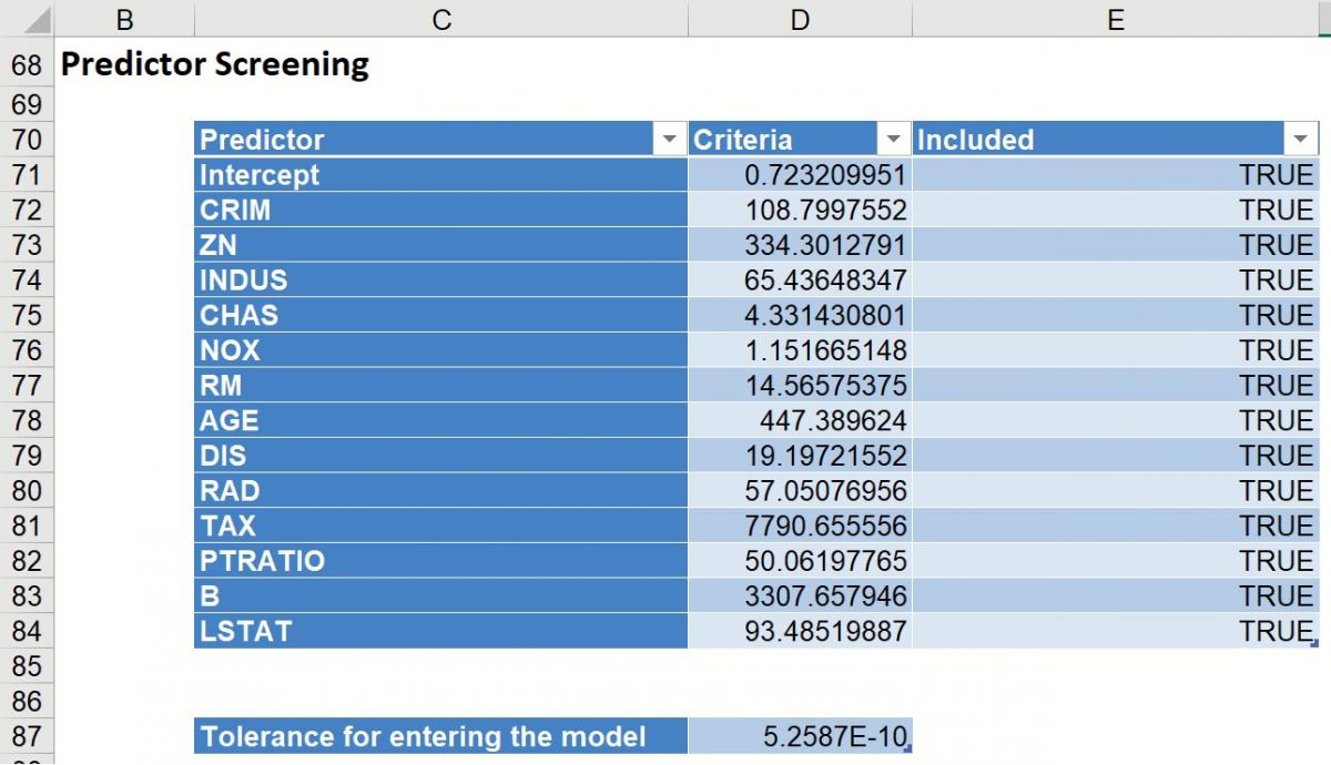 Included and excluded predictors are shown in the table below. In this model there were no excluded predictors. All predictors were eligible to enter the model passing the tolerance threshold of 5.26E-10. This denotes a tolerance beyond which a variance – covariance matrix is not exactly singular to within machine precision. The test is based on the diagonal elements of the triangular factor R resulting from Rank-Revealing QR Decomposition. Predictors that do not pass the test are excluded.