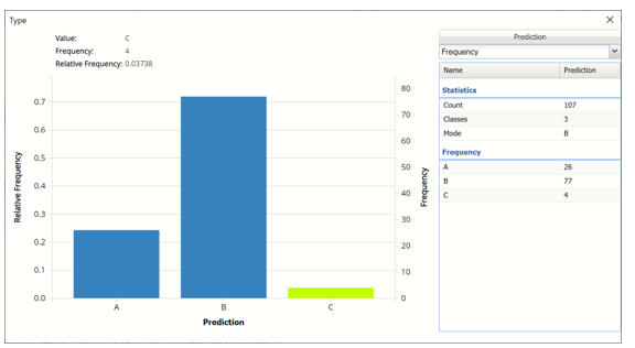 Click the Frequency chart to display the frequency for both the predicted and actual values of the output variable, along with various statistics such as count, number of classes and the mode. Selective Relative Frequency from the drop down menu, on the right, to see the relative frequencies of the output variable for both actual and predicted. See above for more information on this chart.