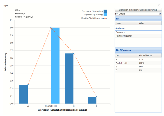 Note the red Relative Bin Differences curve. Click the arrow next to Frequency and select Bin Details from the menu. This tab reports the absolute differences between each bin in the chart.