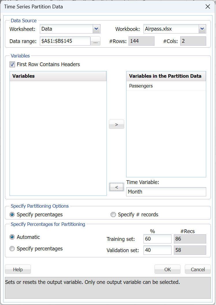 Select Month as the Time Variable, and Passengers as the Variables in the Partition Data. Click OK to partition the data into Training and Validation Sets. (Partitioning is optional. Smoothing techniques may be run on full unpartitioned data sets.)