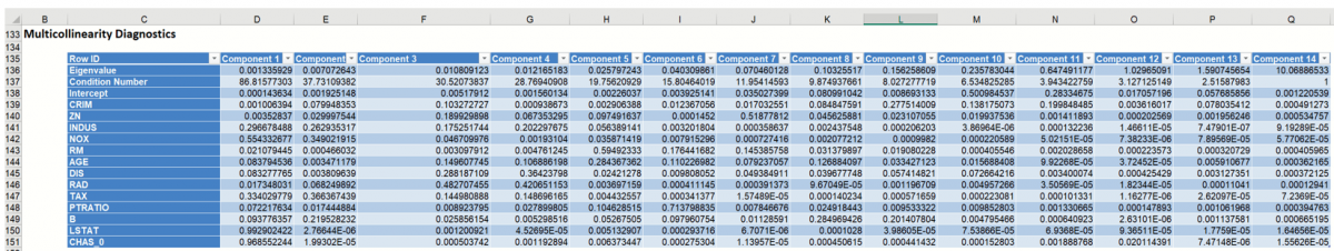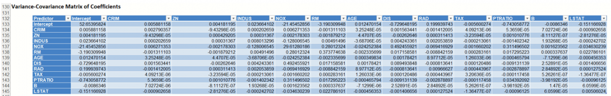 Note: If a predictor is excluded, the corresponding coefficient estimates will be 0 in the regression model and the variable – covariance matrix would contain all zeros in the rows and columns that correspond to the excluded predictor. Multicollinearity diagnostics, variable selection and other remaining output will be calculated for the reduced model.