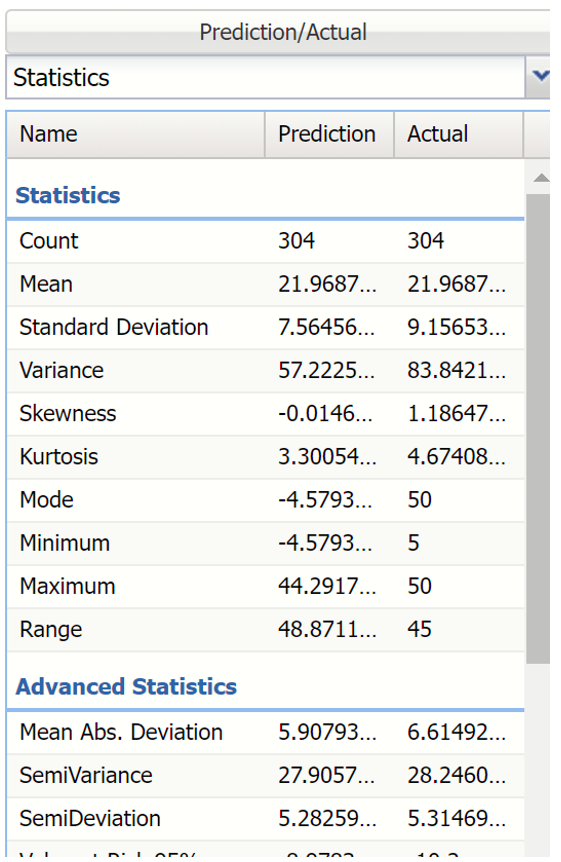 Notice in the screenshot below that both the Actual and Prediction data appear in the chart together, and statistics for both data appear on the right.