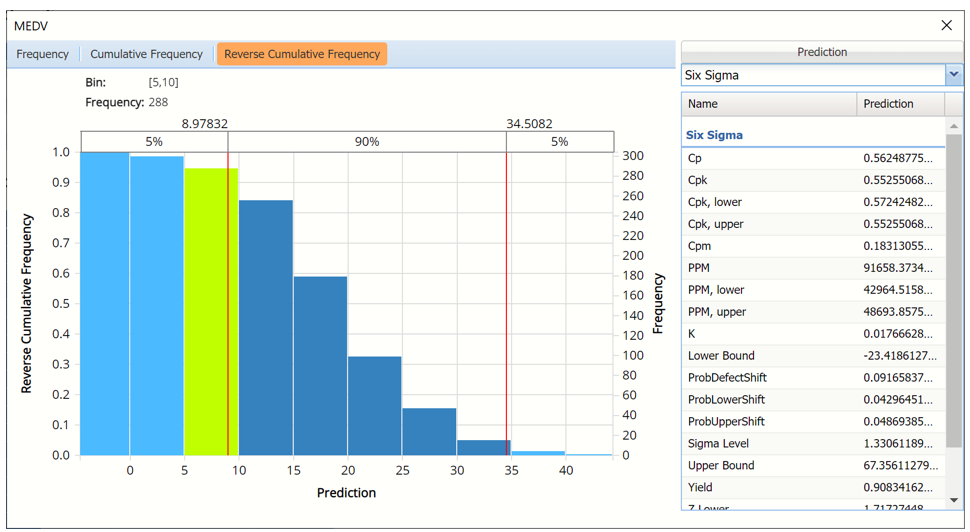 As discussed above, see the Analyze Data section of the Exploring Data chapter in the Data Science Reference Guide for an in-depth discussion of this chart as well as descriptions of all statistics, percentiles, bin details and six sigma indices.