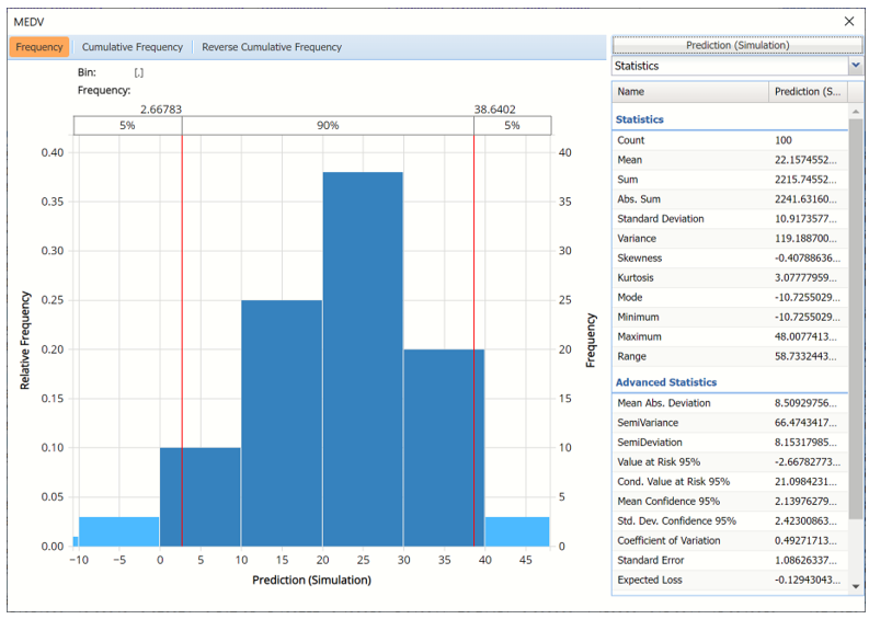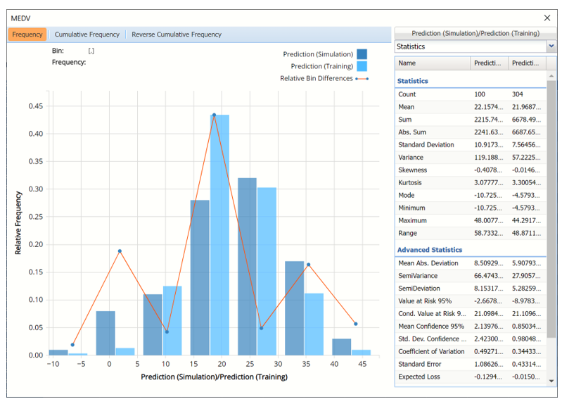 The chart that is displayed once this tab is selected, contains frequency information pertaining to the predicted value for the MEDV variable in the synthetic data.