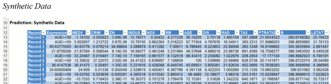 This report contains the synthetic data, the predicted values for the simulation, or synthetic, data, the predicted values for the training partition (using the fitted model) and the Excel – calculated Expression column, if populated in the dialog. A dialog may be opened to switch between the synthetic data, training data and the expression results, or a combination of two, as long as they are of the same type.