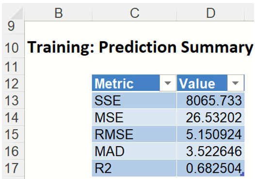 Prediction Summary: In the Prediction Summary report, Analytic Solver Data Science displays the total sum of squared errors summaries for the training partition. The total sum of squared errors is the sum of the squared errors (deviations between predicted and actual values) and the root mean square error (square root of the average squared error). The average error is typically very small, because positive prediction errors tend to be counterbalanced by negative ones.