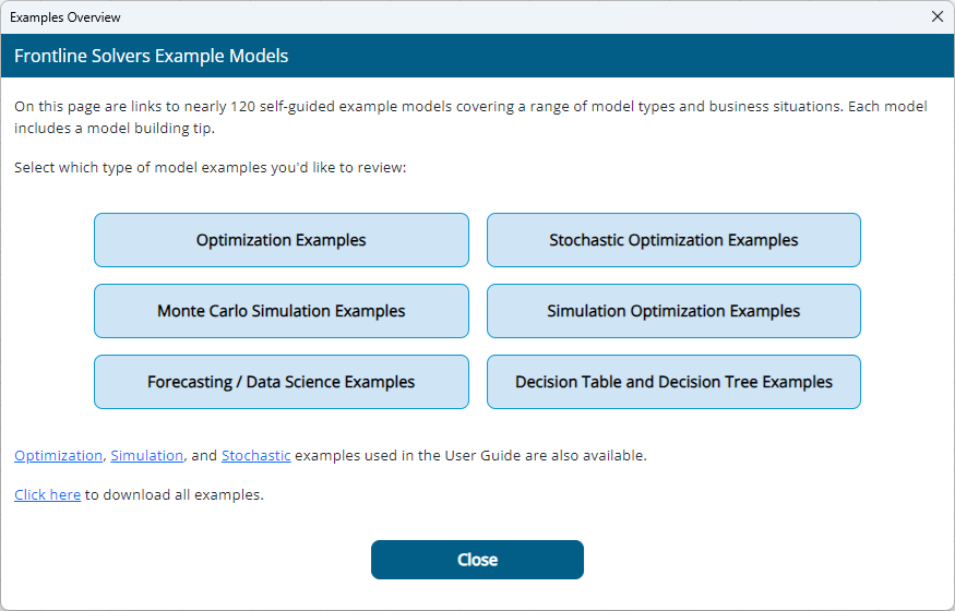 If you haven’t looked at the dialog above or clicked any of the buttons shown, here’s what you’re missing: 43 Optimization example workbooks (many with multiple examples: 2 in Product Mix, 4 in Transportation of Goods, 8 in the User Guide examples workbook); 16 Stochastic Optimization examples; 38 Monte Carlo Simulation examples; 4 Simulation Optimization examples; 34 Forecasting / Data Science examples; and 14 Decision Tree and Decision Table examples.