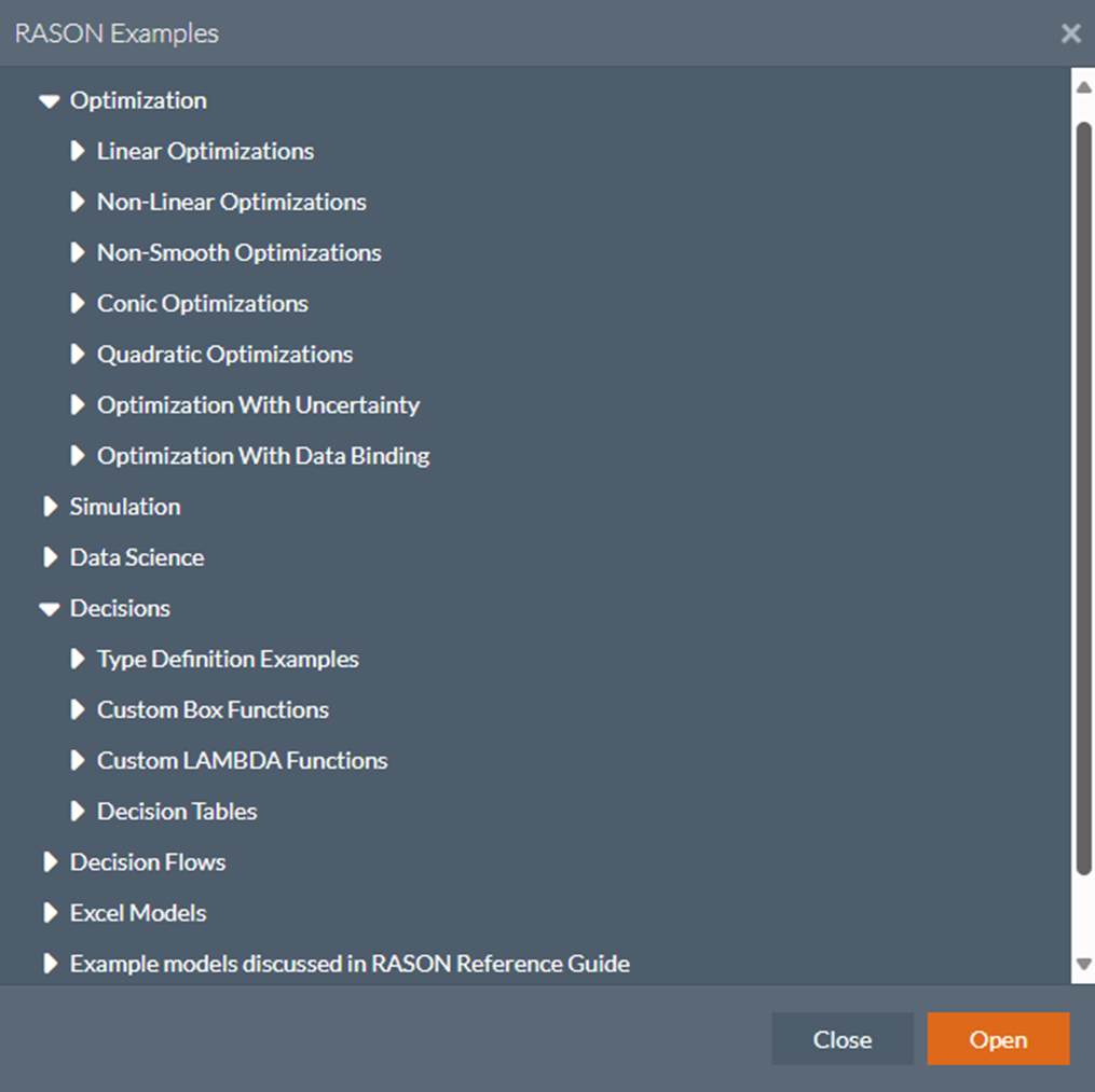 In our RASON cloud platform, where there are over 180 example models available from the toolbar button RASON Examples, we see the same thing: users skip this step and plunge in to build their own model. Did you know, for example, that this button gives you access to almost 80 examples just in Data Science and Machine Learning – as well as 34 examples in Optimization and 17 examples in DMN Business Rules and Decision Tables?