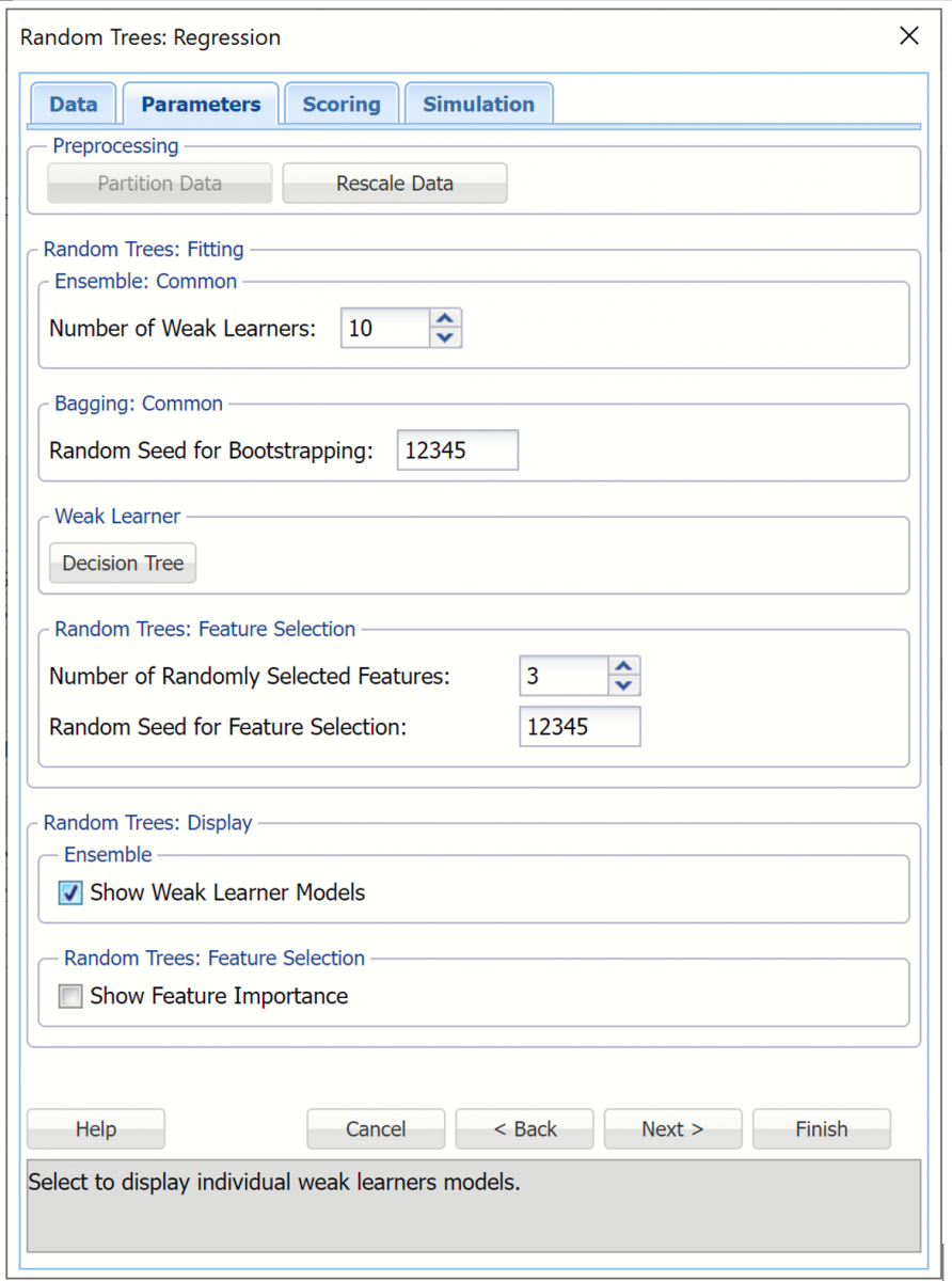 Recall that Random Trees only supports Decision Trees as a Weak Learner. Click Decision Tree to change any options associated with this algorithm. This example uses the default settings for the Decision Tree algorithm. For more information on these options, see Regression Trees.