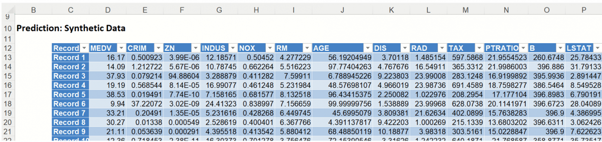 This report contains the synthetic data, the predicted values for the training data (using the fitted model) and the Excel – calculated Expression column, if populated in the dialog. Users can switch between the Predicted, Training, and Expression sources or a combination of two, as long as they are of the same type.