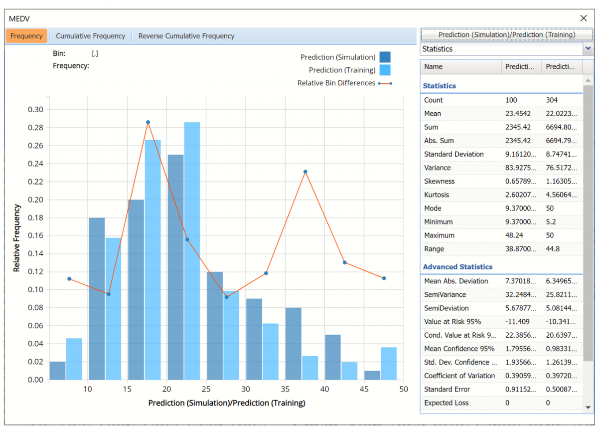 When Frequency Chart is selected, a frequency chart will be displayed when the RRandTrees_TrainingScore and RRandTrees_ValidationScore worksheets are selected. This chart will display an interactive application similar to the Analyze Data feature, explained in detail in the Analyze Data chapter that appears earlier in this guide. This chart will include frequency distributions of the actual and predicted responses individually, or side-by-side, depending on the user’s preference, as well as basic and advanced statistics for variables, percentiles, six sigma indices.