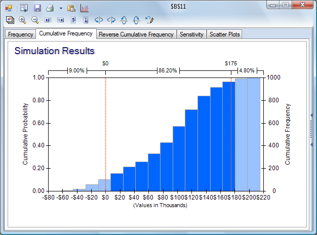 Because a simulation yields many possible values for the outcomes we care about -- from Net Profit to environmental impact -- some work is needed to analyze the results. For instance, we can summarize the range of outcomes using various kinds of statistics, such as the mean or median, the standard deviation and variance, or the 5th and 95th percentile or Value at Risk. It is also very useful to create charts to help us visualize the results -- such as frequency charts and cumulative frequency charts