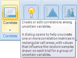 You simply select uncertain variables from an outlined list in the dialog, and click the New icon in the title toolbar.  You'll be prompted to select a cell range on the worksheet for the matrix.  As you fill in matrix elements, Risk Solver updates the cell range, and it also adds the proper PsiCorrMatrix() property function calls to your distribution functions.  A correlation matrix must be symmetric -- the element at position i, j must equal the element at position j, i -- so whenever you enter or edit a matrix element i, j in the Correlation dialog, Risk Solver will update the j, i element to match.
