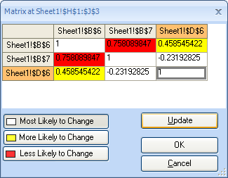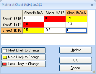 In the example matrix above -- which is not (yet) consistent -- suppose we are happy with the rank correlation of 0.8 between variables B6 and B7; we have a tentative value of 0.5 for the correlation between B6 and D6; and we have no special information about the relationship between D6 and B7. We can indicate this by clicking the red button 'Less Likely to Change,' then clicking either 0.8 element, and clicking the yellow button 'More Likely to Change,' then clicking either 0.5 element.