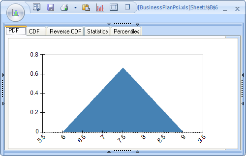 In its simplest form, the Uncertain Variable dialog shows a chart of the distribution's probability density (PDF) or cumulative density (CDF) function. Below is an example of a Triangular distribution. Notice that all four borders of the dialog may be clicked to display more information. You can also use the two rightmost icons in the title toolbar to fully expand and contract the dialog. The Statistics and Percentiles tabs display analytic moments and percentile values, computed from the distribution parameters.