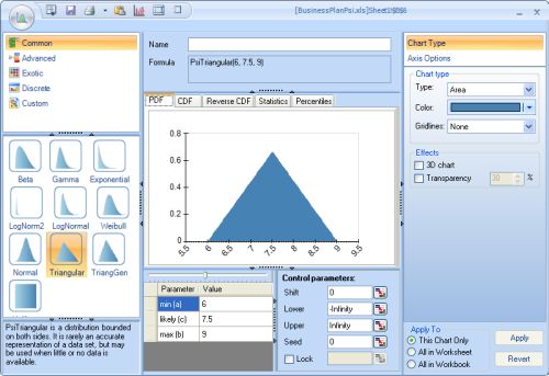 The top of the Uncertain Variable dialog contains a formula, such as =PsiTriangular(6, 7.5, 9) above, that will be written to the active cell on the worksheet when you click the Save icon in the title toolbar, or when you close the dialog and answer Yes to a prompt.