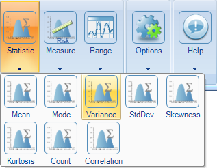 The Statistics gallery provides easy ways to compute the Mean, Mode, Variance, Standard Deviation, Skewness, and Kurtosis of an uncertain function, or the Pearson product-moment correlation coefficient between two uncertain variables or functions. You can also obtain a Count of all Monte Carlo trials, normal trials, or error trials.