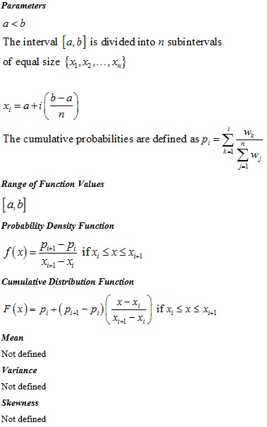 PsiHistogram (a,b,{w1,w2,…,wn},…) is a custom continuous distribution with lower and upper bounds equal to a and b respectively, and with user specified weights w1,w2,…,wn corresponding to n subintervals of equal size. This is similar to a PsiCumul (a,b, {x1,x2,…,xn},{p1,p2,…,pn},…) distribution, where the probabilities are calculated using the weights as shown below, and the interval defined by the bounds a and b is divided into subintervals of equal size as described below.